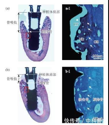 图3 不同钛金属种植体植入感染模型动物口腔牙缺失部位3个月后的组织学观察(a,a-1)纯 Ti 种植体,由于感染导致与牙槽骨之间存在很大空隙;(b,b-1)Ti-5Cu 种植体,显示明显的抗感染作用